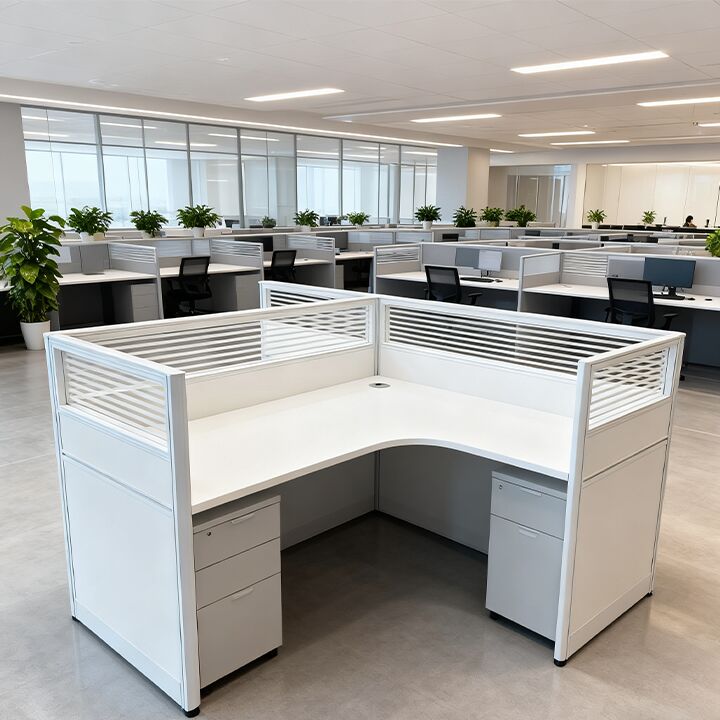Bureau moderne en bois avec écrans en verre pour postes de travail de bureau, fabrication